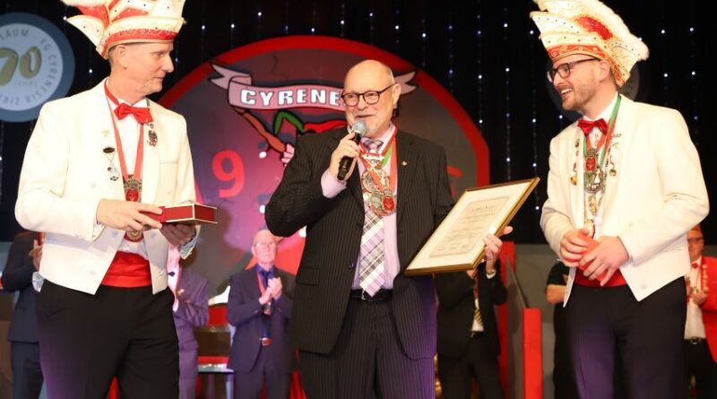 Im Rahmen unserer gestrigen 3. Prunksitzung durften wir einen ganz besonderen Moment erleben: Die Faschingsgesellschaft Cyrenesia hat zum dritten Mal überhaupt den Goldenen Cyrenesen verliehen – die höchste Auszeichnung der Cyrenesia Zirndorf.